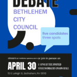 The BCDC is hosting a Bethlehem City Council Candidate Debate on April 30th at 1pm at the United Steelworkers Union Hall (53 E. Lehigh St, Bethlehem). All Bethlehem residents and interested parties are welcome to attend. Light refreshments will be served. This button will load a Zoom seminar, available from … Continue reading →